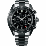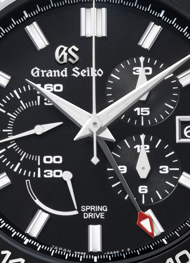 Inspired by traditional samurai armor, SBGC223 features a titanium inner case so the watch is light and comfortable on the wrist, and an outer case in black ceramic to protect the parts that would otherwise get scratched through daily or active use. Given that zirconia ceramic is seven times harder than steel, new polishing techniques were required to give the watch Grand Seiko’s distinct distortion-free finish. To keep the black dial as clean and legible as possible, the small second hand is presented in a semi-circle dial that shows 00 to 30 seconds on the inner ring and 30 to 60 on the outer ring. The two different shapes of the propeller hand allow the seconds to be read at a glance. Visible through an exhibition case back is Caliber 9R86, the powerhouse movement driving the watch. It’s a Spring Drive chronograph with a column wheel and a GMT function, and it’s rated to +/-15 seconds a month with a power reserve of 72 hours.