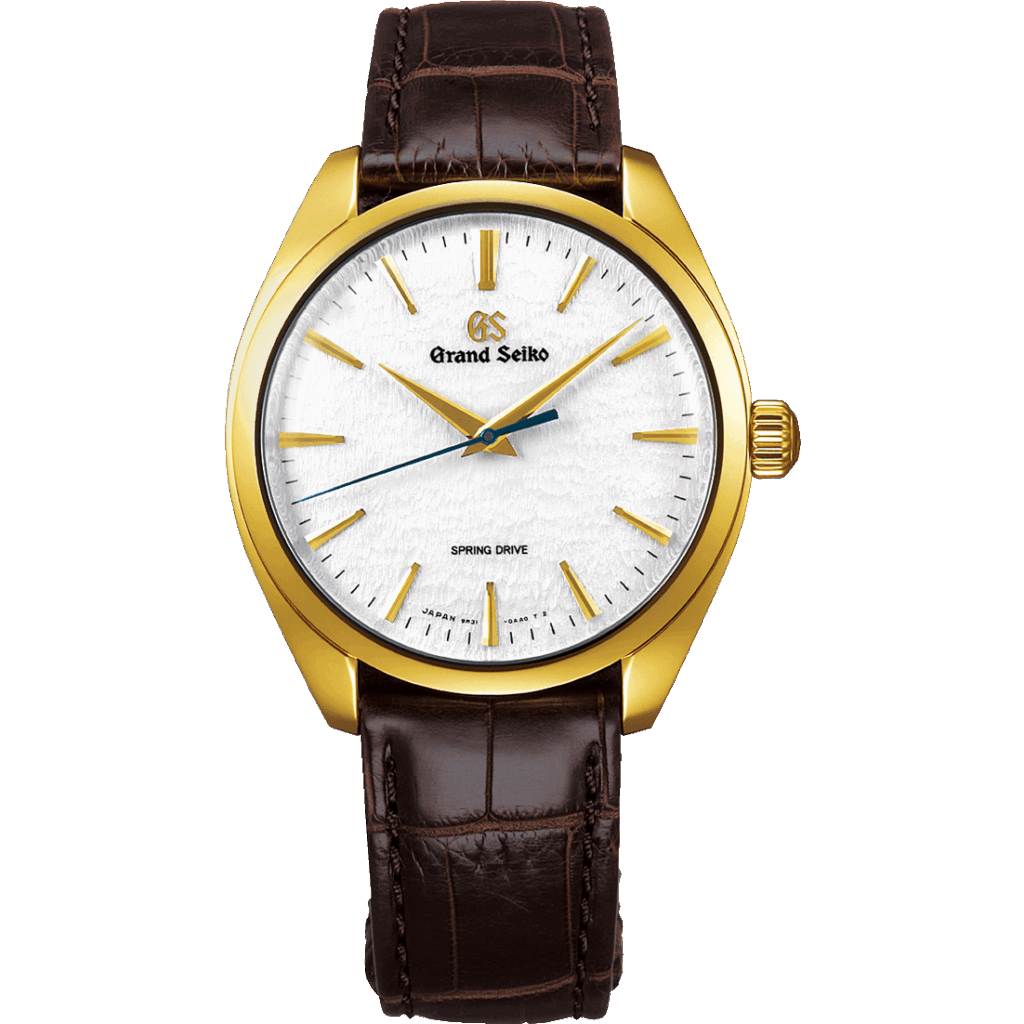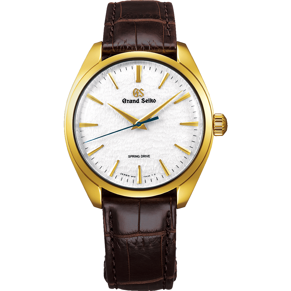 The dial expresses a distinct pattern known as the "Snowflake," inspired by the wind-swept snow in the mountains of Shinshu. This dial design was first introduced in Japan in 2005 and globally in 2010, and it became an immediate hit. This mesmerizing texture gives the dial ample dimensionality and results in a truly unique timepiece. The blued steel second hand moves smoothly in a continuous gliding motion, a feature that is emblematic of Spring Drive, and the blue of the hand contrasts beautifully against the white of the dial and the warmth of the yellow gold case.